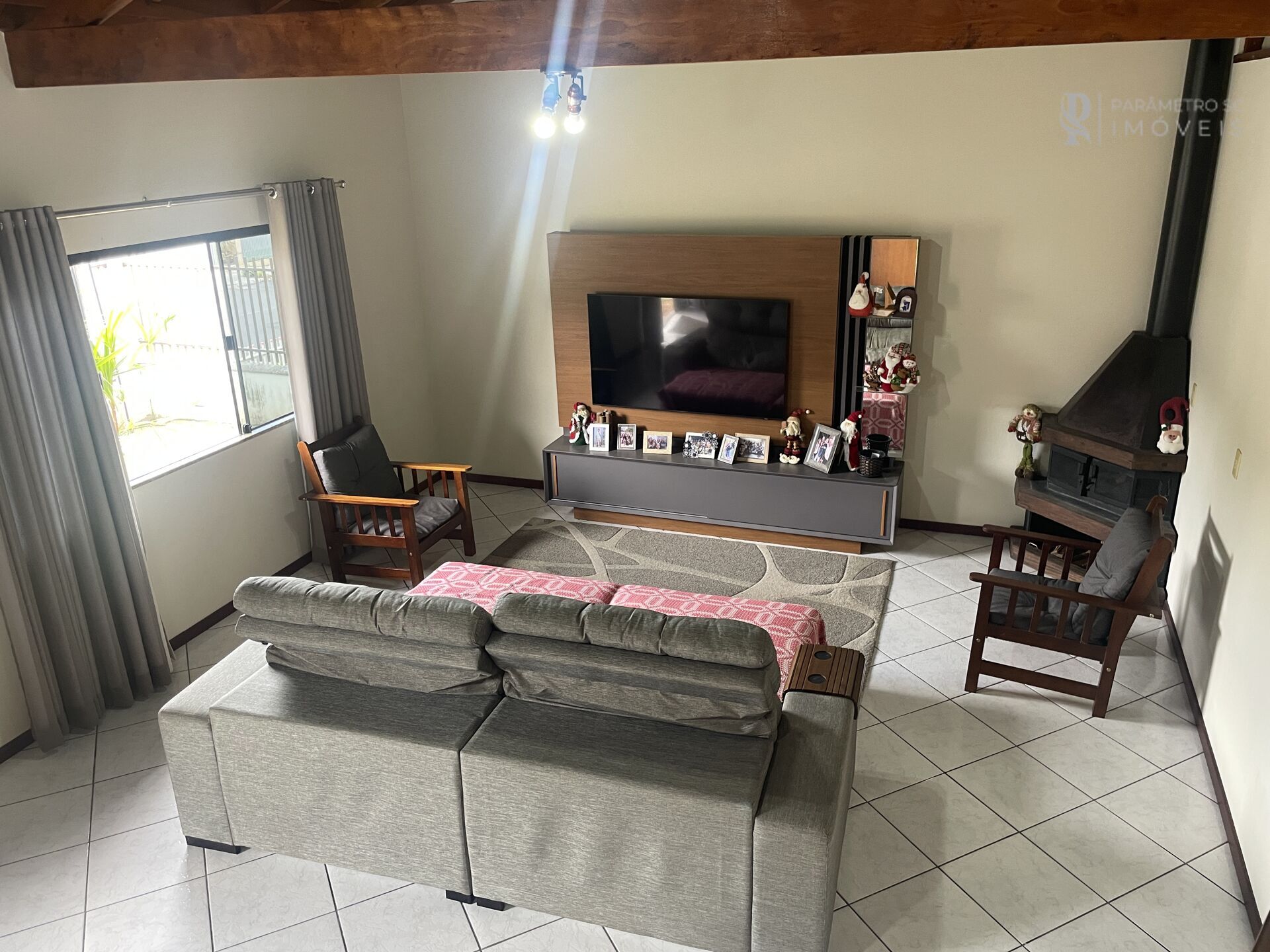 - Sala de estar com TV e lareira, trazendo aconchego e sofisticação